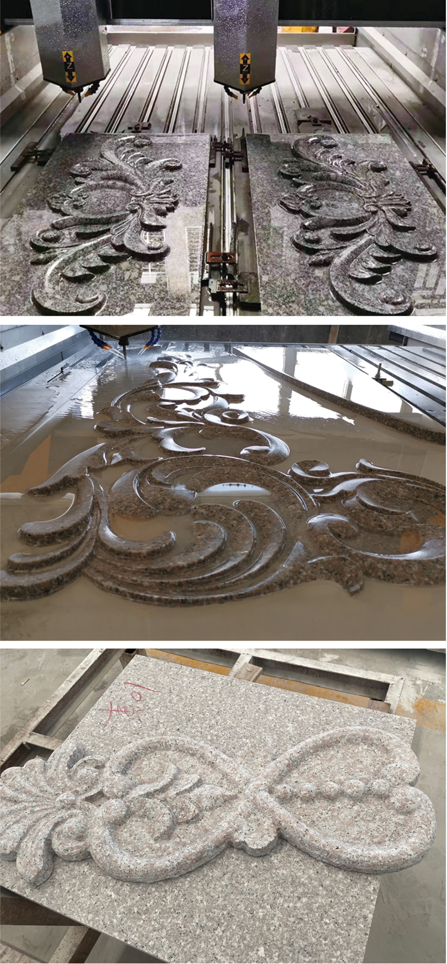 本机采用数控系统控制,三轴联动,双排四列滑块,恒功率主轴电机,双向刀具冷却系统,具有运行平稳、精度高和效率高等优点,适用于加工大理石、花岗岩、青石、玉石、玛瑙、铜板和铝板等材料