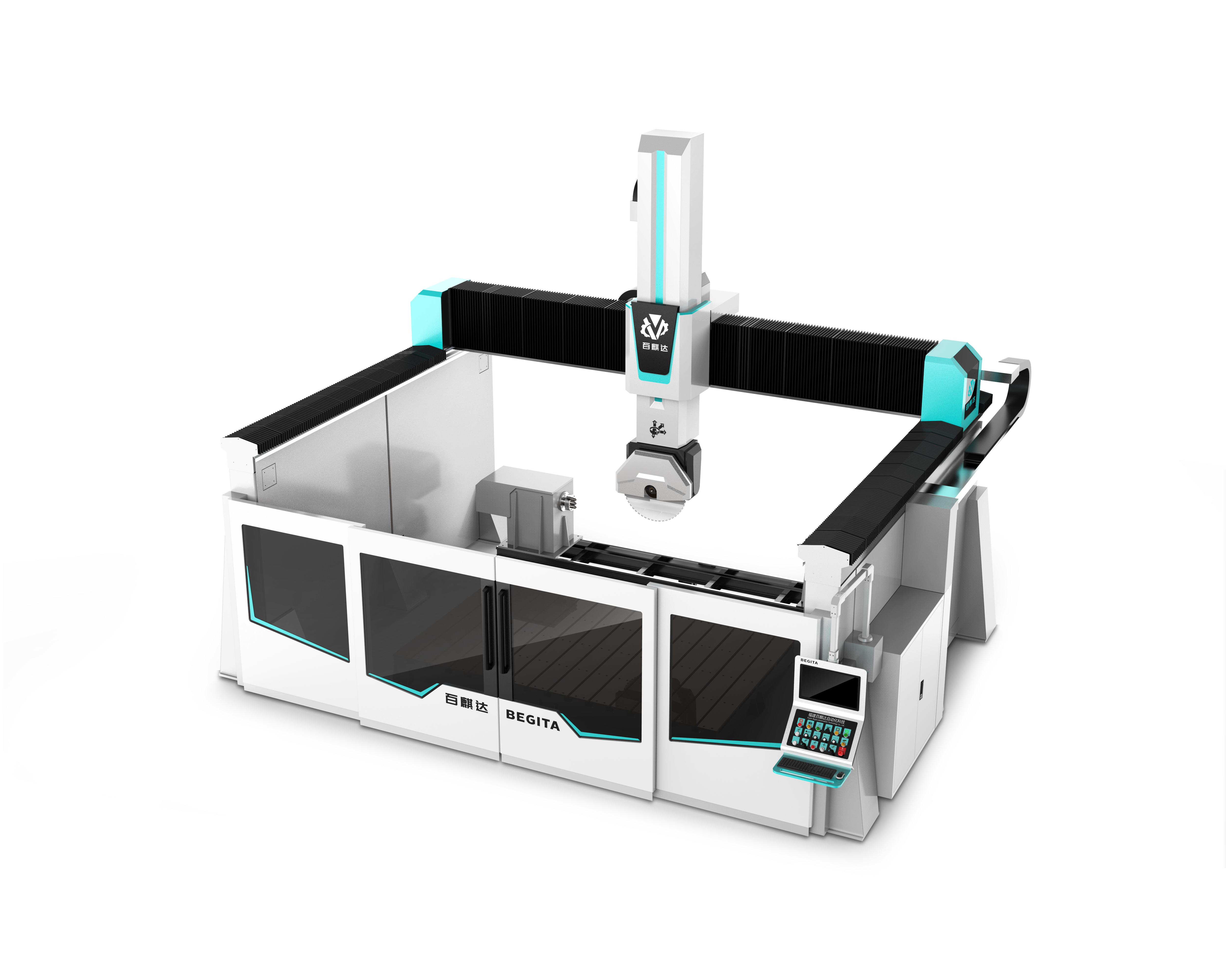 五轴加工中心采用高端五轴联动数控系统,进口 BT 主轴,进口直线导轨、齿条传动,总线绝对值伺服控制,具有多功能、高精度、稳定性强等优势。该设备包含常规切割功能、仿形加工、园林异形材加工、高端别墅的石材加工功能等,并且主要针对中大型的石材产品,可切可雕,是一款专业解决石材各种异形加工的新利器。